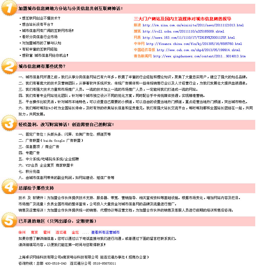 來(lái)自:以上為城市信息網(wǎng)招商網(wǎng)的截圖,詳情請(qǐng)點(diǎn)擊查看 http://www.city28.com/zhaoshang/ 城市信息網(wǎng) 誠(chéng)招各地方分站合作伙伴 媒體支持:新浪網(wǎng)IT頻道、網(wǎng)易新聞中心、騰訊科技、搜狐科技、中華網(wǎng)財(cái)經(jīng)頻道、電腦報(bào)南京站、中國(guó)經(jīng)濟(jì)導(dǎo)報(bào)